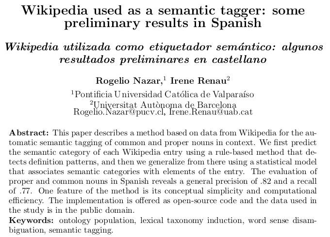 Nazar, R.; Renau, I. (2026). Wikipedia used as a semantic tagger: some preliminary results in Spanish. Procesamiento del Lenguaje Natural, n. 76, p. 279-292.