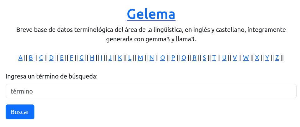 Gelema is a small terminology database in the field of linguistics generated entirely with generative artificial intelligence, specifically gemma3 and llama3 LLMs, used locally and programmatically thanks to the ollama.com project.